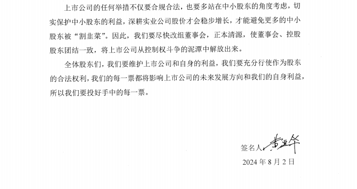 信中提及自第二大股东捷登零碳入主上市公司以来,公司主营业务陷入困境、新能源业务裹足不前,且捷登零碳方未对上市公司提供应有的流动性支持。作为实际控制人的黄业华提出需尽快改组董事会,并呼吁全体股东在即将召开的临时股东大会上积极投票,结束控制权之争。