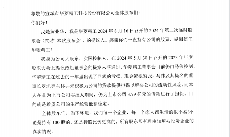 “这不是简单的控制权之争,公司的稳定,涉及千百员工及背后的家庭,更涉及上万股民的血汗投资钱!”8月2日清晨,《华夏时报》记者独家获得的一封由华菱精工(603356.SH)大股东、实际控制人黄业华致华菱精工全体股东的公开信中如此写道。