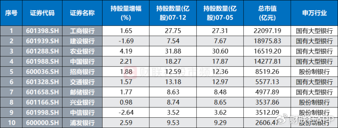 注:总市值居前的银行股近5日北向增减持情况(截至7月12日数据)