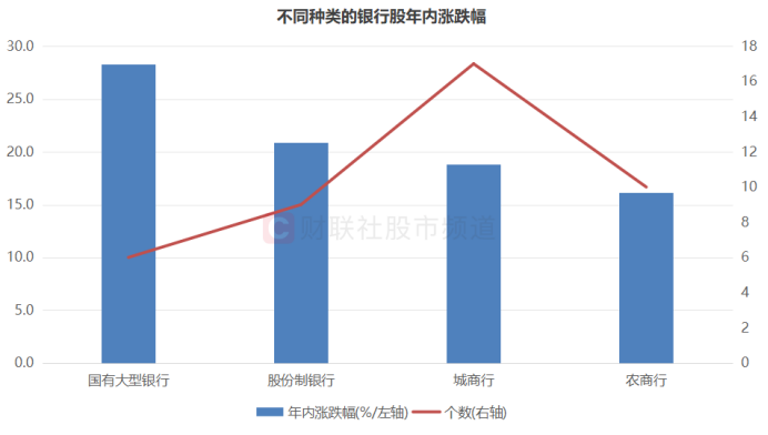 作为今年以来表现最为强势的板块,截至今日收盘,银行板块指数年内累计上涨近18.9%,大超位居第二的公用事业板块(12.8%)。个股方面,银行股年内平均上涨近20%,其中,南京银行、成都银行双双涨超40%。若分银行种类统计,国有大型银行表现最优,其年内涨幅均值近28.3%,而股份制银行、城商行、农商行分别平均上涨近20.9%、18.8%、16.1%。